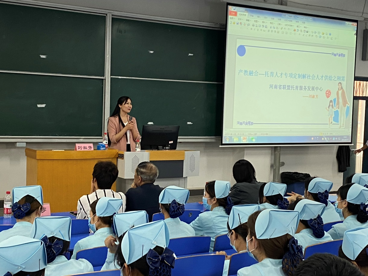 河南省联盟托育服务发展中心秘书长刘教授就目前托育的就业及工作内容进行了深入的讲解,通过讲解及视频展示,让同学们在轻松的氛围里了解了未来工作的内容及资质要求,同时也展示了托育行业未来就业的广阔前景!