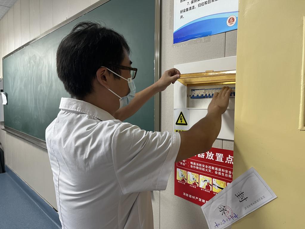 随后,部分实训管理员、教师在D404实训室开展应急防汛演练和安全排查。首先实训室柳超老师检查门窗闭合和电力照明使用情况。董亚楠老师负责消杀防疫工作。接着全体参与教师开展避险演练,由张家梁老师模拟紧急切断电源,其他教师有序疏散至安全区域,演练进行有序认真,并于演练过后再次检查确认实训室物品安全、门窗电源关闭情况。