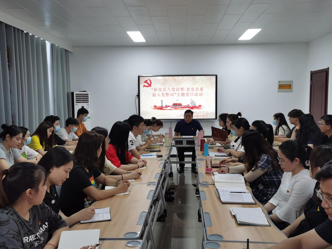 在中国共产党成立100周年到来之际,2021年6月17日下午,护理学院党总支在党员活动室召开“新党员入党宣誓、老党员重温入党誓词”主题党日活动,为预备党员举行入党宣誓仪式,增强其责任感、使命感、归属感;老党员重温入党誓词,增强党性观念,强化责任担当。护理学院全体预备党员、部分教师党员参加,活动由党总支书记杨明杰同志主持。