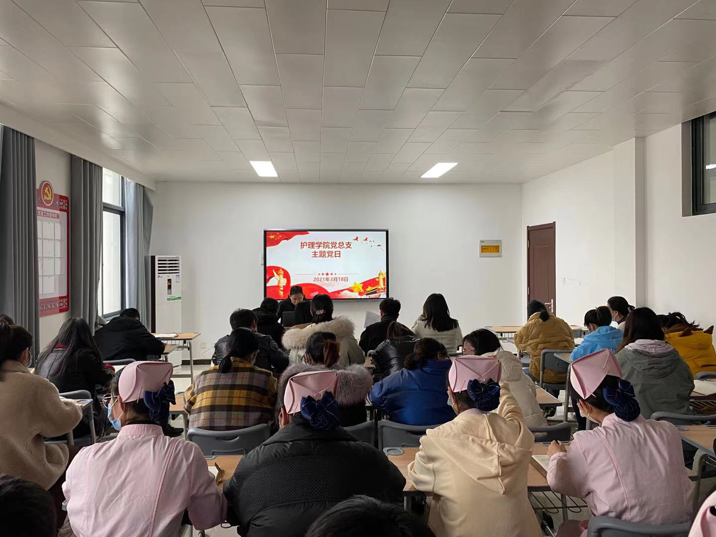 2021 年是中国共产党成立 100 周年,是“十四五”规划开局之年。为进一步乘势而上,顺势而为,做好师生思想政治工作,弘扬脱贫攻坚精神,2021年3月18日下午,护理学院党总支组织教工支部、学生支部全体党员及部分学生入党积极分子在A515党员活动室开展以“脱贫攻坚,彪炳史册”为主题的党日活动-春季开学第一课。