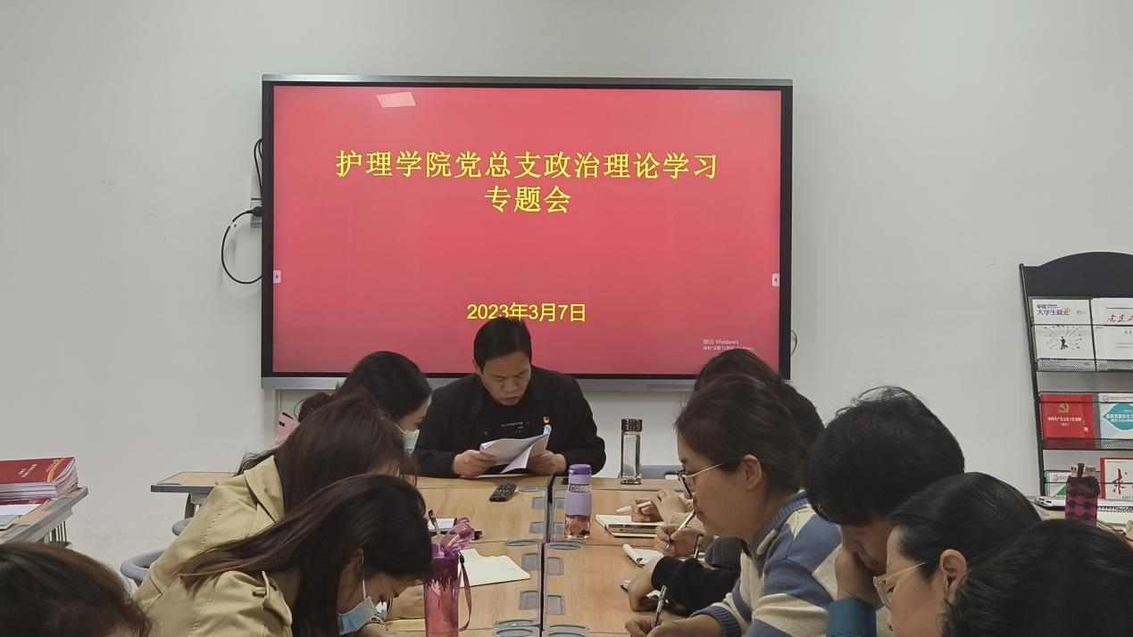 根据学校党委宣传部安排,2023年3月7日,护理学院党总支组织全体教职工在A515党员活动室召开政治理论学习专题会,会议由护理学院党总支书记杨明杰主持。