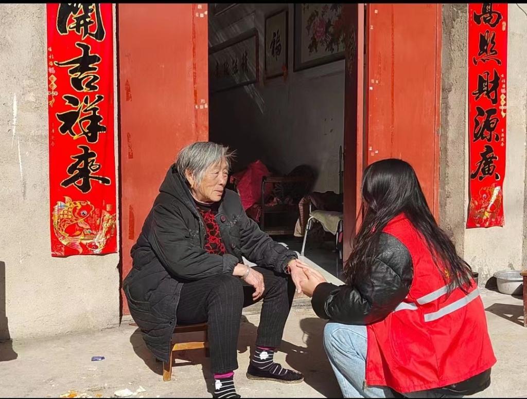 护理2202班吴曼曼同学,大年初六在临颍县黄帝庙村参与关爱老年人活动,陪伴老人聊天