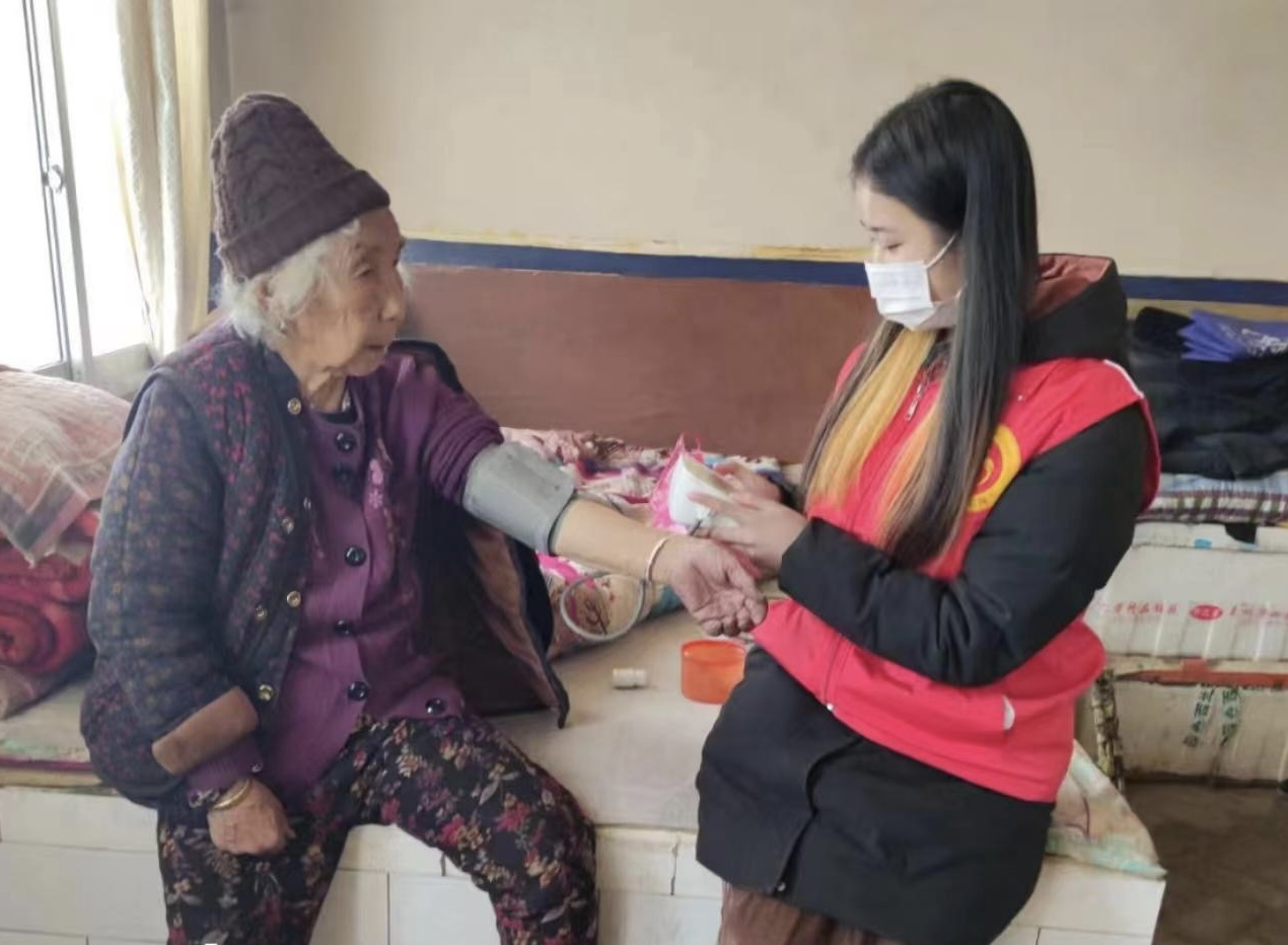 康复2102班王璐同学,在寒假期间参与乡村关爱孤寡老人活动,为老年人测量血压