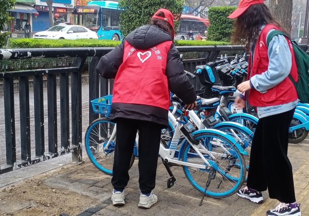 康复2102班刘奕菲同学,参加焦作市山阳区组织的志愿者活动,在街道上帮助共享单车合理归位