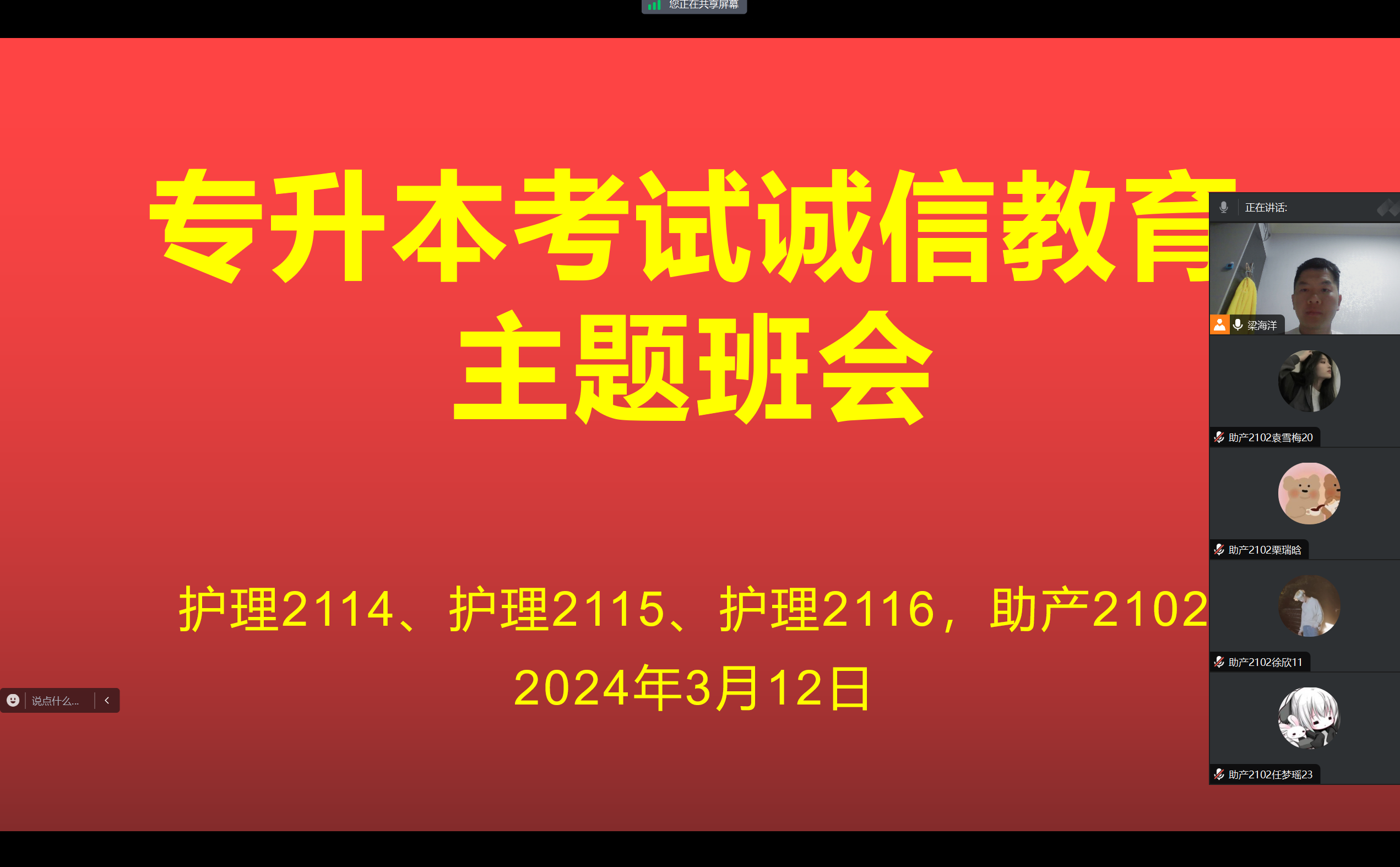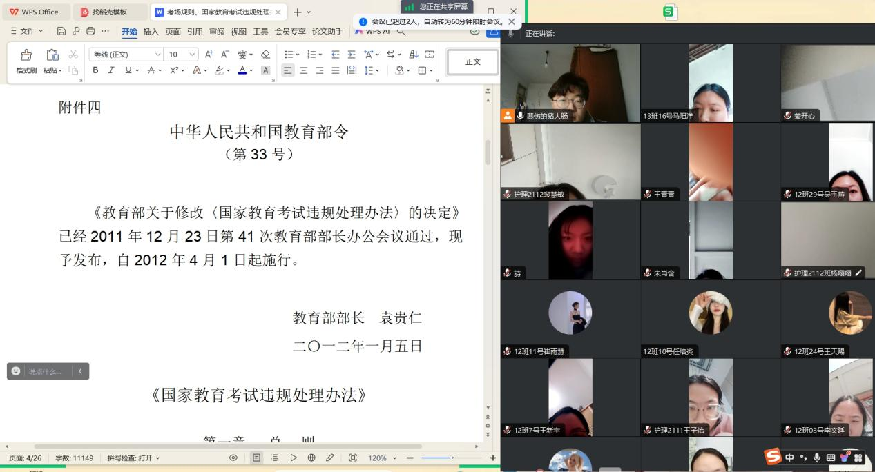 2024年专升本考试临近,为做好专升本考生考前相关工作,进一步端正考风、严肃考纪,引导考生树立诚信考试的正确价值观,护理学院于2024年3月12-3月16日之间召开线上专升本考试诚信教育主题班会,会议由2021级辅导员主持,各班专升本考生积极参会。