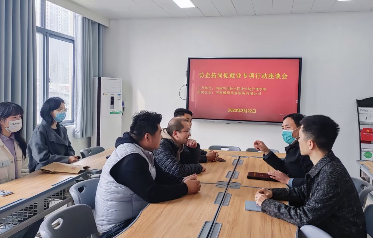 为深入贯彻落实党中央、国务院“稳就业”“保就业”决策部署,进一步深化校企合作,拓宽毕业生的就业渠道,3月22日上午,护理学院党总支书记杨明杰、校企合作与就业处副处长张万仑和河南豫痘美容服务有限公司负责人王新等人在行政楼515召开访企拓岗促就业座谈会。
