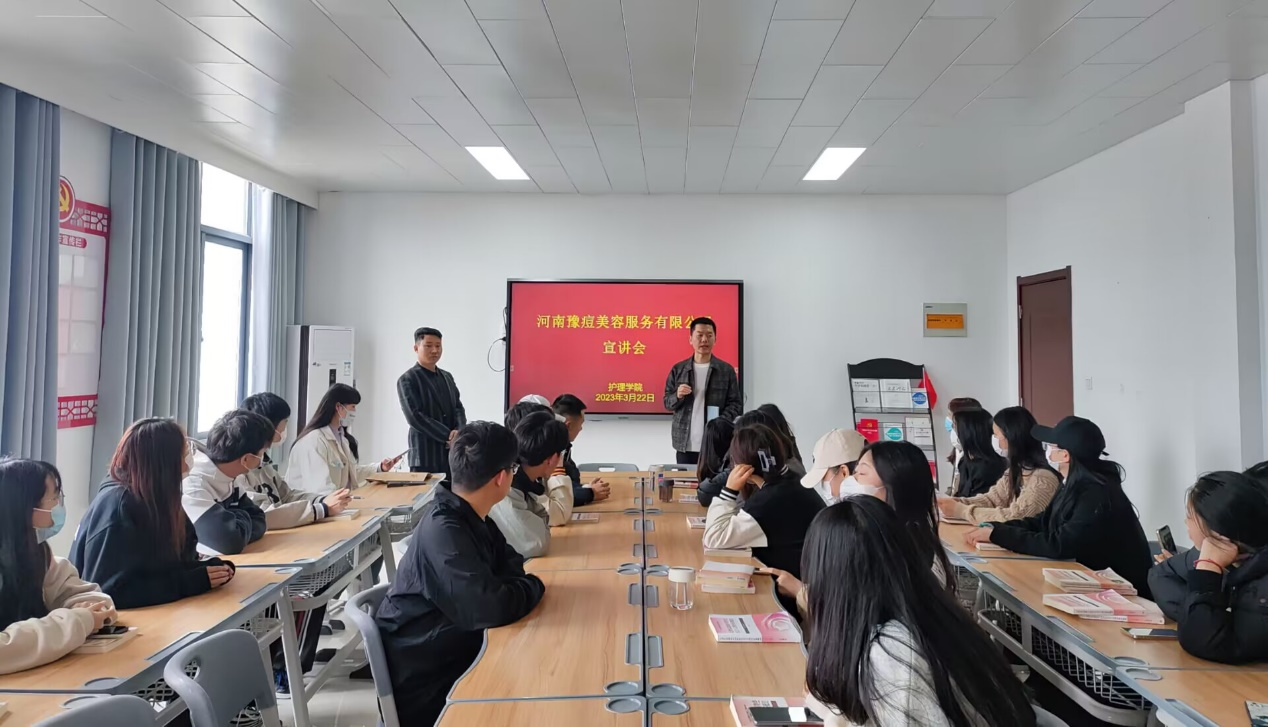 座谈会后,护理学院组织召开河南豫痘美容服务有限公司招聘宣讲会,王新经理向同学们介绍了公司的福利待遇和发展前景,并解答了同学们的疑问。多名学生表示有意愿从事医美行业。