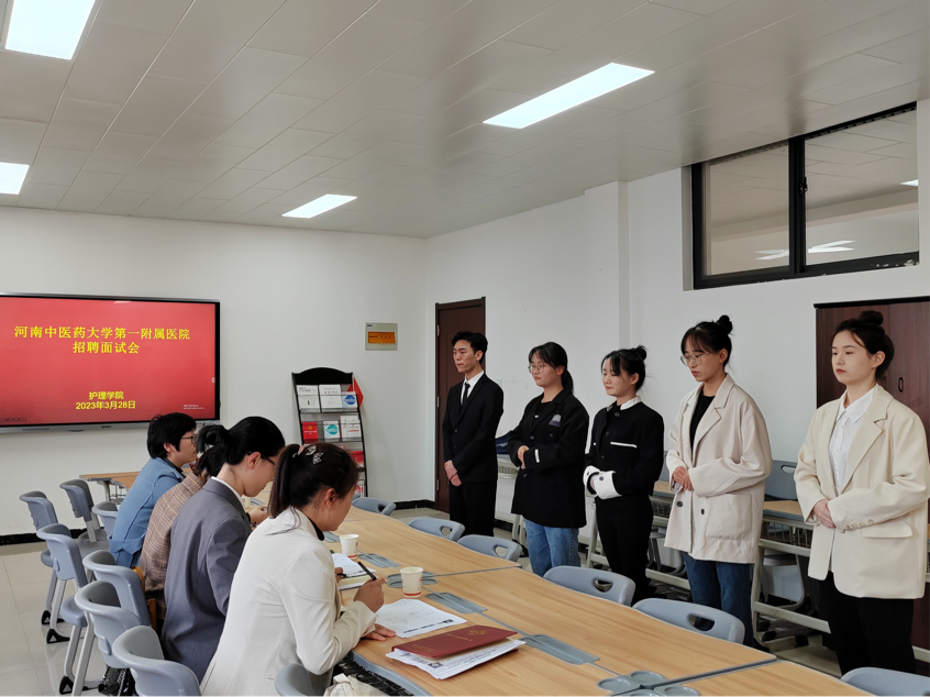 河南中医药大学第一附属医院护理部罗慧敏老师借助视频为同学们介绍医院的基本情况、护理教学管理概况及实习就业要求和准则。讲座结束后,在行政楼515进行招聘面试。面试中,贝博学生镇定自如,自信稳重,凭借扎实的理论知识和良好的临床技能,得到面试老师的充分认可。