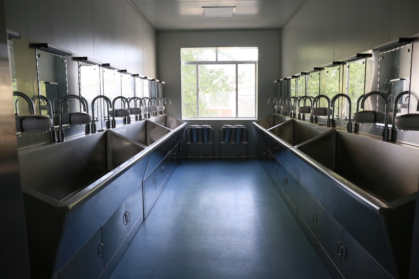 (1)实训室简介:本实训室的核心设备为外科刷手设施,与医院设施一致,学生可以真实练习外科手消毒。本实验室建成后,受益学生已经达到900人,承担妇科技能训练达到2400人次。